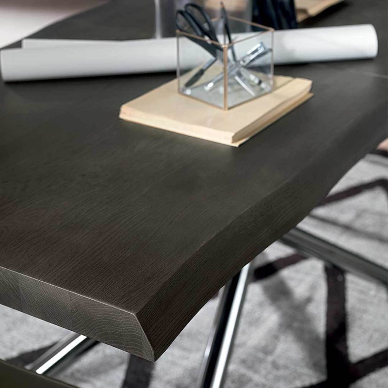 Metal frame extending dining table, top in melamine, wood or mortar-look, 2 inside extensions. Thickness of melamine top and mortar-look top: cm 8. Thickness of wooden top: cm 5.