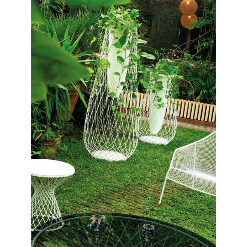 Heaven is a line of shapes elementary but important for the harmony of proportions that characterize it as an image of elegance and balance. The steel is woven as a fabric through a single welding process, the space is lightened by the intertwining metal that makes the volume of objects incorporeal.