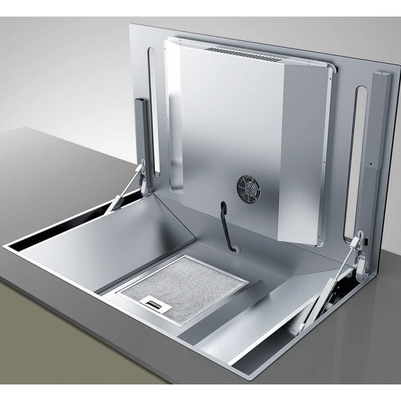 The hood is equipped with a compact motor and can be connected to a pipe for the evacuation of fumes outside or used with a long-lasting anti-odor filter module with the air that comes back filtered in the kitchen. Air-0 purifying module also available. With 2 double pistons the glass opens and remains in the desired position and closes down in a fluid manner without the risk of falling.