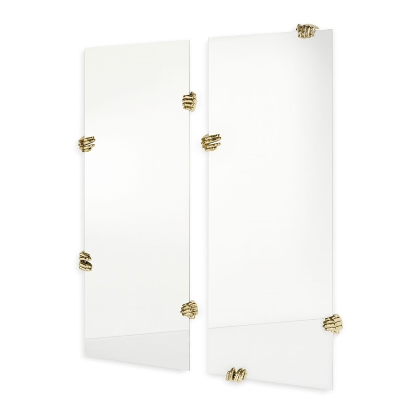 Selfie is a wall mirror with decorative hands in cast brass. The Selfie collection emphasizes the illusory dimension of the mirror and multiplies reality through a series of hands positioned on the edge of the mirrors, creating different configurations.