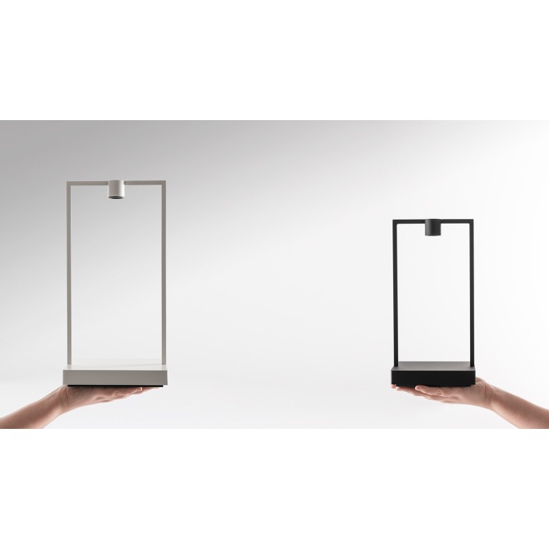 Versione FOCUS della nuova lampada da tavolo portatile Curiosity di Artemide, che attraverso la sua forma svela la sua vocazione espositiva ma al tempo stesso relazionale, mette in scena gli spazi dove stanno le persone o gli oggetti che può accogliere al suo interno.